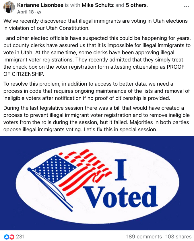 In interviews and on social media, Lisonbee claims an anonymous “whistleblower” has provided her with information that at least one person who is not a U.S. citizen has registered and voted in Utah elections since 2020.