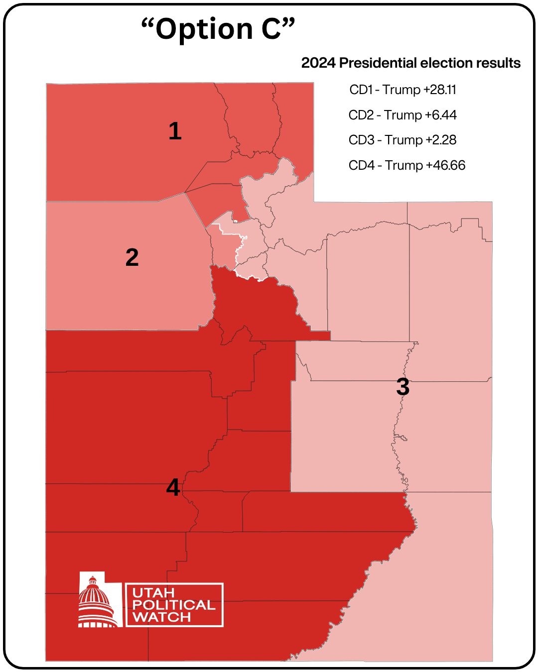 While lawmakers can’t discuss partisan information when drawing the maps, there’s nothing in the law about political parties. And while the Utah GOP’s first choice would probably be to keep the 2021 congressional map in place because it all but guarantees a Republican victory in the state’s four congressional districts, they’ve landed on a new map they think gives them the greatest partisan advantage.