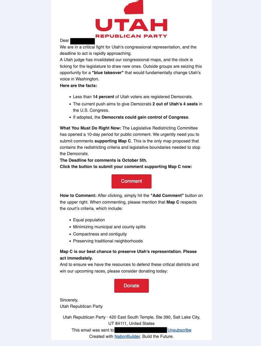 “For weeks, Republican members of the redistricting committee have lectured Utahns about avoiding partisan commentary and keeping politics out of the process. Meanwhile, their own party is flooding inboxes with instructions on which map to support—because it’s the least competitive—and defend it. The hypocrisy is stunning,” King said.
